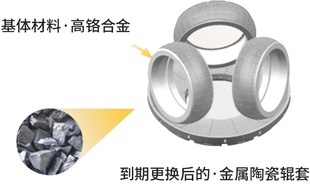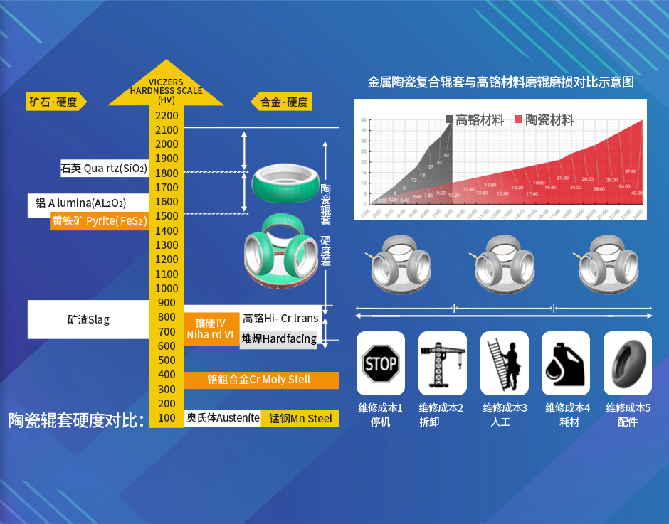 - 傳統(tǒng)堆焊/高鉻輥套HV硬度普遍約為650,而陶瓷合金HV硬度可達(dá)1850-2100,新材料帶來(lái)傳統(tǒng)材料的2.0-3.0倍的使用壽命.更長(zhǎng)的單次使用周期,為企業(yè)減少停機(jī)、拆卸、人工、耗材、配件等維護(hù)成本。